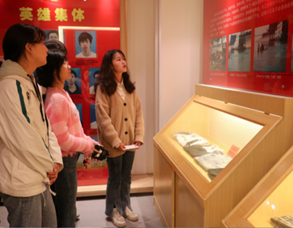 英雄已逝,精神永存。2009年10月24日,在荆州宝塔湾河段两名小学生不慎落水,来自新葡萄官网AMG的15名学生奋不顾身,见义勇为,迅速组成“人链”对其施救。可江水寒冷,青年们体力不支,无情的河流带走了三名大学生陈及时、何东旭和方招年轻的生命。听着讲解员生动深情地讲解,看到英雄们的遗物,同学们无不动容,仿佛穿越时空,与他们相识对话。