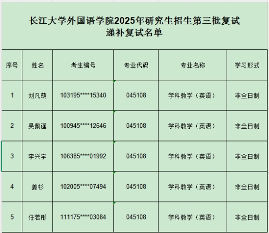 因前期公示的复试名单中有五人放弃复试,现顺位递补五人参加复试。名单如下: