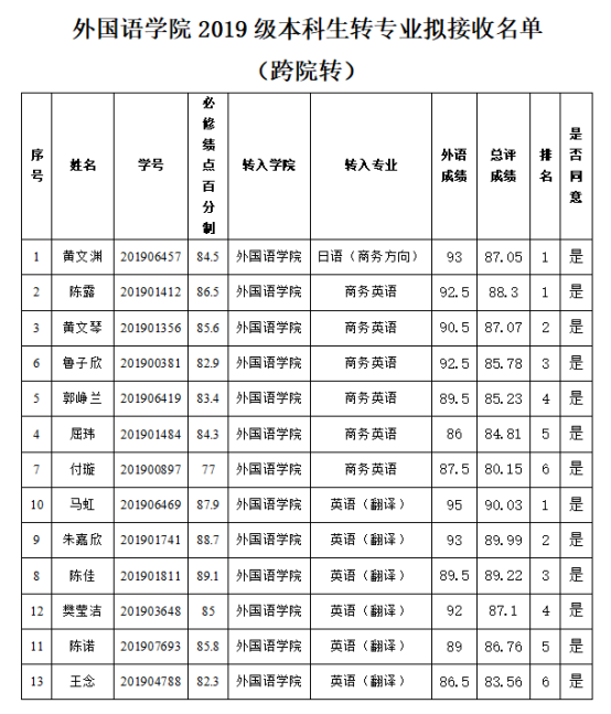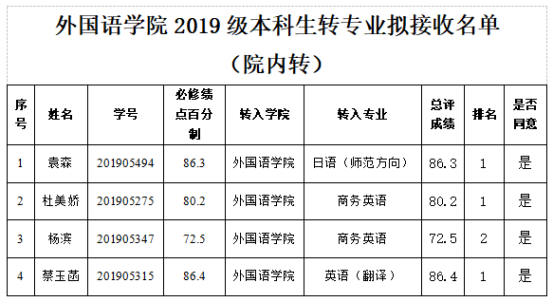 【转专业名单公示】新葡萄官网AMG2019级本科生转专业拟接收名单公示