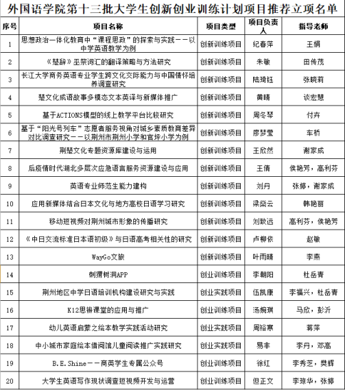 根据《关于我校第十三批“大学生创新创业训练计划”项目申报的通知》要求,经项目团队申报、学院组织专家对项目申报材料从项目可实施性、实施对象明确性、实施方案具体性等方面进行审议,拟推荐《刺猬树洞APP》等20个项目为第十三批“大学生创新创业训练计划”立项项目(名单见附表)。