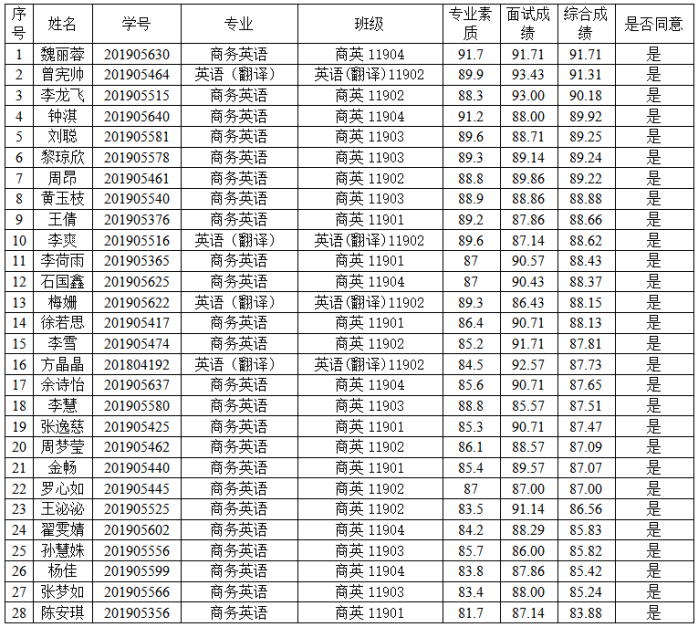 经过学生本人申请、学院资格审核、面试考查、综合成绩评定,现将我院2019级商务英语专业“卓越国际人才”实验班拟录取名单予以公示: