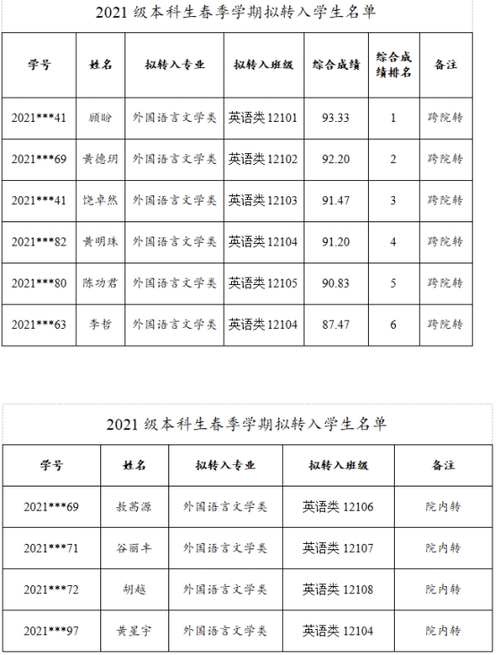 新葡萄官网AMG2021级本科生春季学期转专业拟接收名单公示