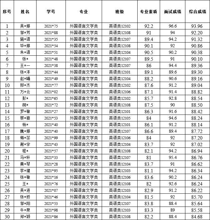 经过学生本人申请、学院资格审核、面试考查、综合成绩评定,现将我院2021级商务英语(卓越)班拟录取名单予以公示: