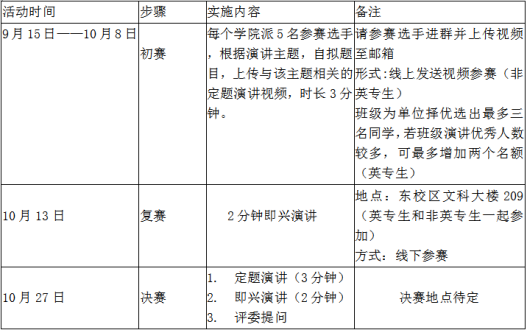3)报名方式:以学院为单位集中报名。各分团委学生会请于10月8日17:00前择优推荐5名选手,并将报名汇总表以“XX学院—新葡萄官网AMG外研社·国才杯英文演讲比赛”命名后发送至邮箱3027311928@qq.com;并提醒选手上传视频到邮箱3027311928@qq.com并通知选手加入2022新葡萄官网AMG英语演讲比赛群,获取更多信息和比赛指导。