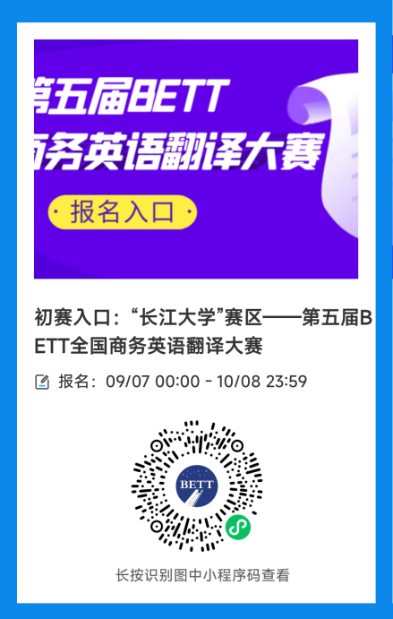 为提高在校大学生翻译及应用技能的积极性,在中国城市商业网点建设管理联合会指导下,由中国城商联外研分会主办的第五届BETT全国商务英语翻译大赛将于2023年10月中旬在新葡萄官网AMG举办初赛选拔赛。大赛初赛优异选手由组委会颁发荣誉证书,通过大赛初赛的选手可申领全国商务英语翻译BETT“初级笔译”或“初级口译”证书。大赛分为本科组和研究生组,分为口译和笔译两项赛事。