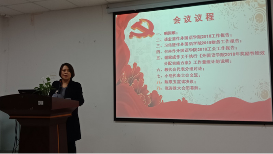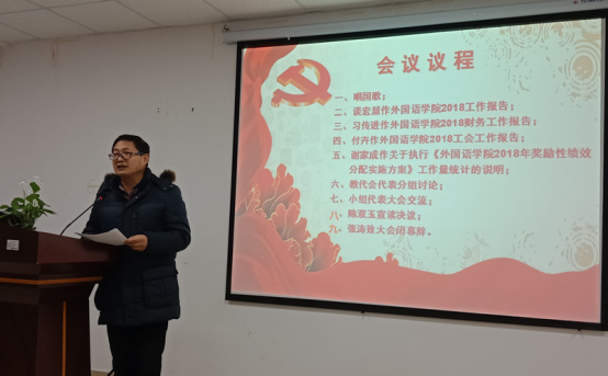 “学者治学、民主建院、凝心聚力促发展”。在教代会分组讨论环节,55名教代会代表分成4组,展开了热烈、充分的讨论,并推选出小组发言人在大会上交流。代表们顾大局、讲责任、讲真话、讲实话,把外院当成自己的家,围绕学院事业发展、奖励性绩效分配方案、学院工会财务与福利等,提出了许多好的意见和建议,反映了广大教职工的呼声,为学院科学决策提供了很好的依据,达成了“深化外语教育教学改革,以人才兴院、以质量立院、以特色强院、以实力赢得应有的尊重和地位”的思想共识,确立了“教学、科研、管理、服务”有效协同落实“四个回归”,多措并举深化立德树人,以“一带一路”和中国文化“走出去”战略为导向,以学生需求为出发点,调整大学英语课程设置打造“金课”、加快高水平人才引进和教师队伍博士化改造等的学院2019年发展思路。