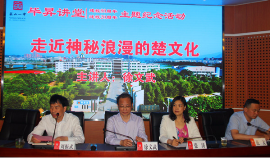 5月5日晚7点,英山一中一楼的报告厅灯火通明、座无虚席。我校文学院教授、硕士生导师、新葡萄官网AMG荆楚文化研究中心主任徐文武以《走近神秘浪漫的楚文化》为题,为英山一中的300余名师生作的精彩的报告。英山一中党委书记、校长刘振武,党委委员、高二年级主任范文,语文和历史学科教师以及高二年级部分学生聆听了讲座。