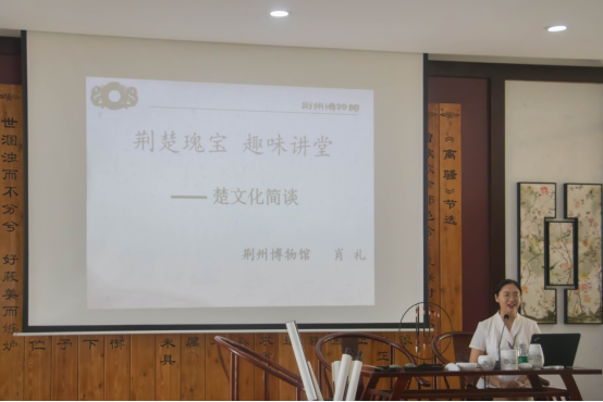 活动的最后一项,大家来到了古色古香的文化讲堂之中,桌上精致的笔架、砚台、原墨还有席地而坐的设计更是彰显了楚文化的传统风格和独特魅力。讲解荆楚文化知识的工作人员热烈欢迎了各位的到来,并从楚国故都—纪南城、丝织刺绣、木竹漆器、楚国风俗以及楚国国君世袭五个方面分别讲述了楚国灿烂的文明成就,大家也对荆楚瑰宝有了更深的了解。