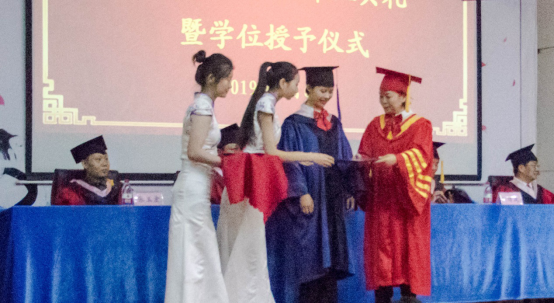 毕业典礼结束后,学位授予仪式开始进行。优秀毕业生们穿着学士服,戴着学士帽,精神抖擞地上台。谈宏慧院长依次为他们拨流苏和颁发学位证,并且合影留念,想必这将是毕业生们终身难忘的回忆!