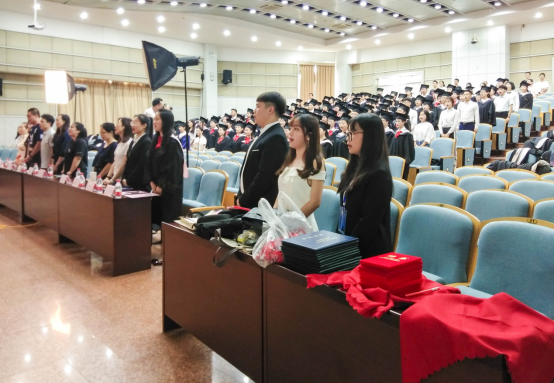 活动开始前,与会同学在老师的指导下,身穿学士服,头戴学士帽,郑重地为即将到来的活动准备着。在张涛书记的主持下,活动正式开始了。首先,全体师生肃立,庄严地奏唱国歌。