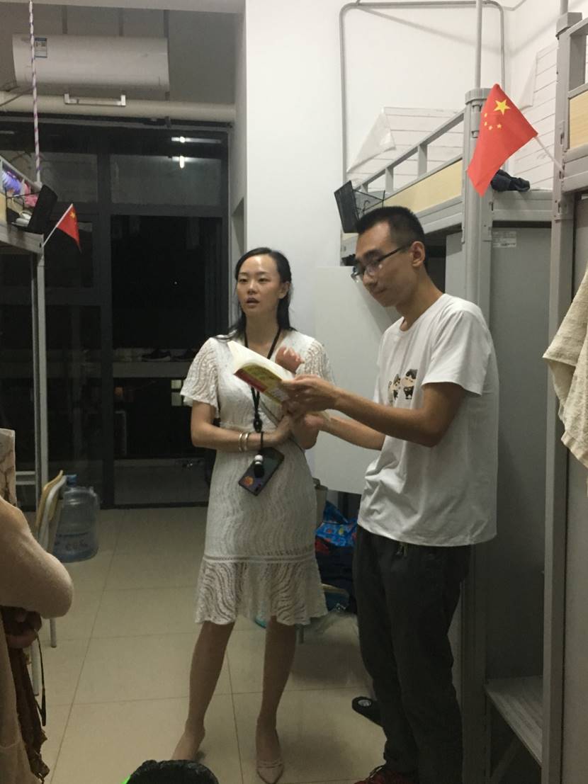 国庆佳节将至,为了提高同学们的安全防范意识,2019年9月27日晚21点,我院分团委书记杜岳青老师和研究生学生会干部应婷,颜倩等人一起走访了学生宿舍,就同学们的学习生活情况进行了解和交谈,并嘱咐大家注意假期安全。