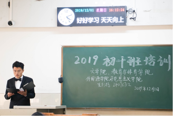 在培训之前,主持人宣读了要求和纪律并简介培训四个内容:学生干部应具备的礼仪知识,班团学生活动组织方法和技巧,学生干部应学会处理的关系以及党的十九大精神。