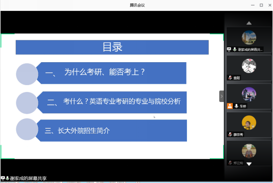 最后,副院长谢家成教授作2021年考研形势分析、政策解读和考研动员,他从为什么考研、院校和专业如何选择、学科学位点介绍、2021年学院研究生招生简章、2021年学院考研政策、创新拔尖项目等六个方面作了详细解读。解读中,对同学们提出三点希望:一是希望2020年考上研究生的同学们珍惜宝贵的深造机会,从新的环境中再次脱颖而出,取得更大的成绩;二是希望2021届同学们明确考研目标,找准前进方向,量力而行,坚定考研意志,绝不轻言放弃;三是希望同学们都要树立终身学习的理念,努力成长为有理想、有担当、有抱负的新时代外语类人才,为学校建设高水平综合性大学目标贡献更大的力量。