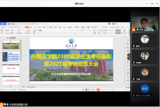 (通讯员:车桥)6月30日晚上7:00,外国语学院利用腾讯会议平台召开2020年考研总结表彰暨2021年考研动员大会。学院副院长谢家成教授、党委副书记魏红洁老师、2017级班主任老师、学工办主任童超老师、2017级年级辅导员车桥老师以及学生代表共200余人参加了会议。会议由2017级年级辅导员车桥主持。