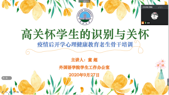 本次会议的主题是“高关怀学生的识别与关怀”,童老师从培训背景、高关怀学生的识别、高关怀学生的关怀与干预方法、以及学校与社会资源这四个方面给同学们展开了讲解。