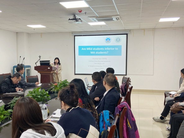 2020年11月5日下午,应新葡萄官网AMG邀请,华中师范大学博士生导师闫春梅教授在文科楼712会议室,为我院师生作了以“学科英语教育硕士的现状与发展”为主题的学术讲座,新葡萄官网AMG老师和全体学科英语专业研究生均参加了此次讲座,现场反响热烈。