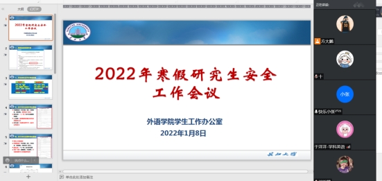 1月8日晚,新葡萄官网AMG通过线上形式召开全体研究生寒假安全教育大会。新葡萄官网AMG党委副书记程坤、全体研究生参会,大会由兼职辅导员方大鹏主持。