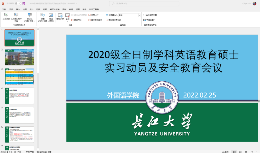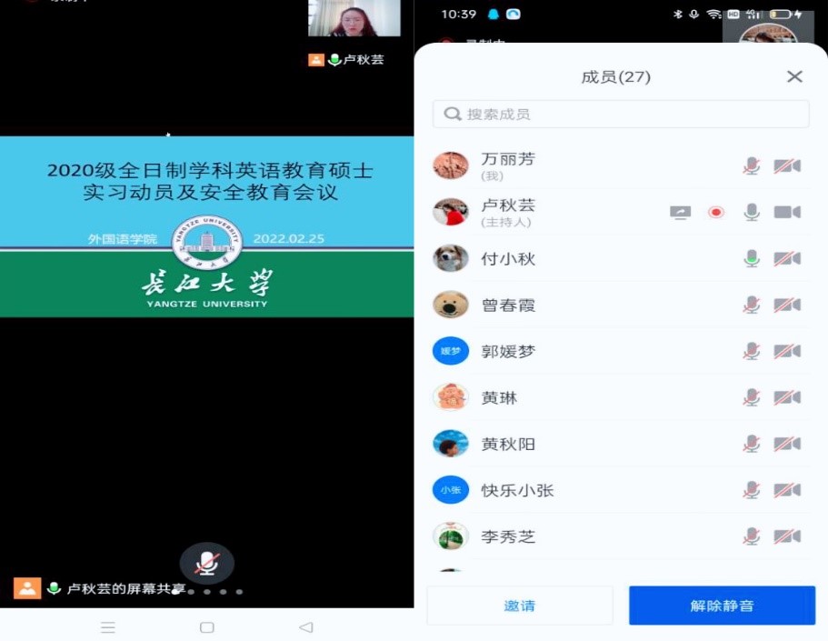 为进一步引导学生做好实习前的各项准备工作,帮助学生顺利完成教育实习环节,2月25日上午,我院通过腾讯会议召开了2020级全日制学科英语教育硕士实习动员及安全教育会议。会议由学科英语教育中心主任卢秋芸博士主持,付小秋副院长、学科英语专业硕士生导师、实习带队导师、2020级全日制学科英语教育硕士参加了本次会议。