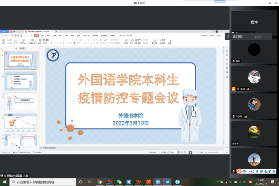 会上,程坤传达了学校疫情防控工作会议的精神,针对目前全国疫情防控局势的逐步加剧,学校已启动疫情防控工作机制,要求责任落实到人,需要积极做好学生各项防疫措施的宣传;其次,他列举了在学生群体中出现的一些典型问题,强调了疫情防控期间的安全风险问题和责任问题;随后,他就学校发布的疫情防控通知中的要求和学院近期将开展的学生安全教育与管理措施进行了说明,希望班主任老师们通过召开线上班会,确保每位同学知晓学校相关疫情防控政策,密切关注学生在生活、思想和学习上的动态。