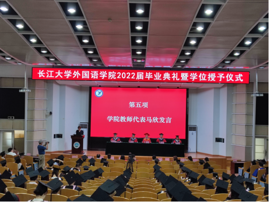 教师代表马欣发言,回顾了与同学们朝夕相处四年来的点点滴滴,希望他们永远不要停止思考,一定养成读书的好习惯,择业一定要选择你喜欢和兴趣所致的工作,沉淀下去,积累下去,才能终有所成。