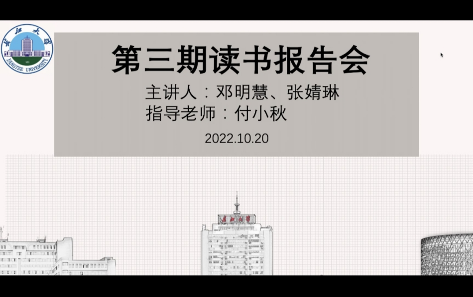 (通讯员 郑甜)10月20日晚7点,为促进学风建设,提升专业素养,结合当前新冠疫情工作安排,新葡萄官网AMG通过腾讯会议举办了本学期第三期研究生读书报告会,此次会议邀请到了新葡萄官网AMG付小秋老师担任评讲导师以及外应QX211班邓明慧、张婧琳同学作为主讲人,2021级、2022级外国语言学及应用语言学专业全体学生和部分本科生参加了本次读书报告会。