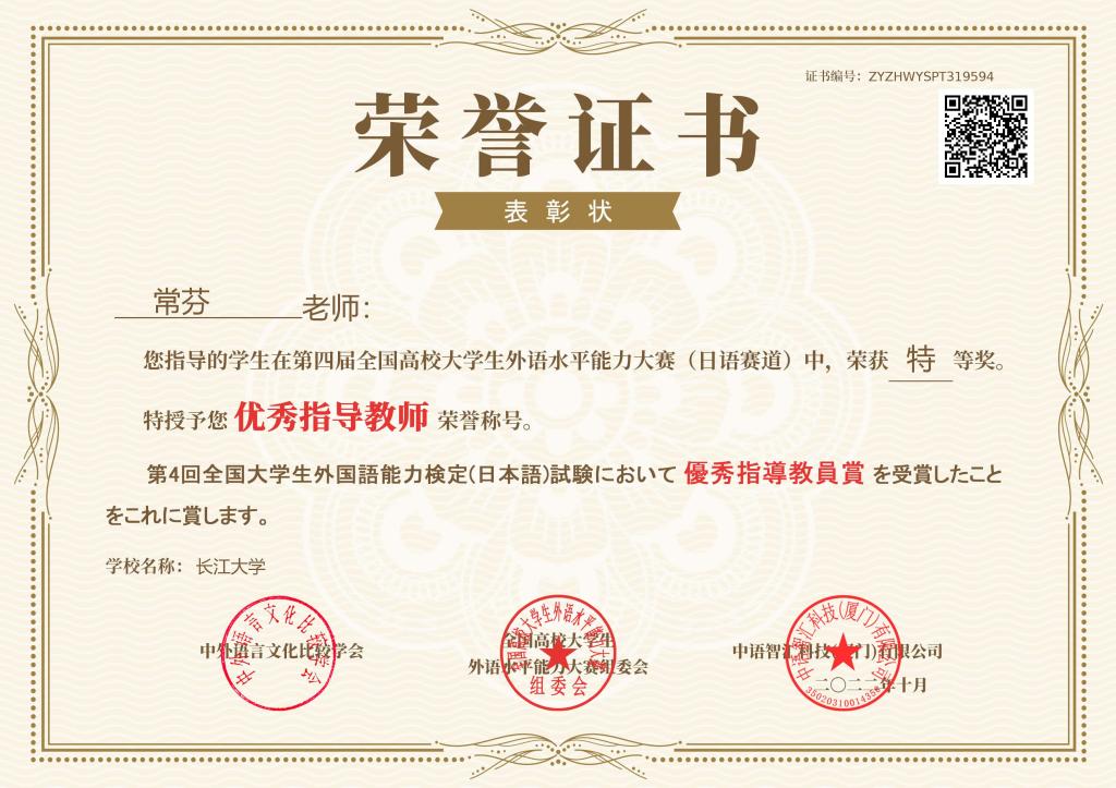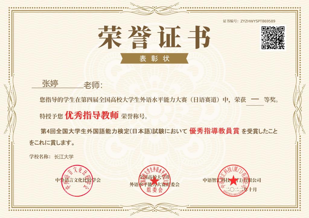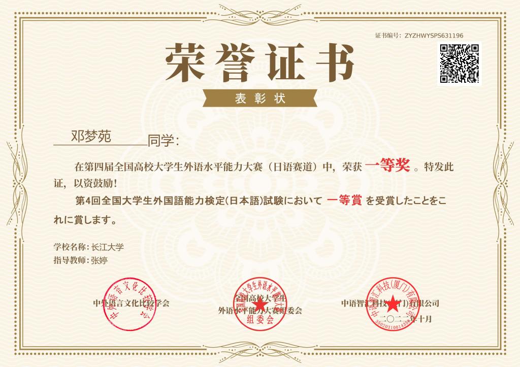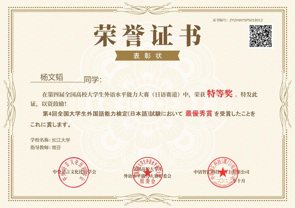 (通讯员 李福兴)11月22日,第四届全国高校大学生外语水平能力大赛-日语赛道决赛落下帷幕。新葡萄官网AMG日语系12101班杨文韬同学以172.6分的佳绩斩获全国第二名,荣获特等奖,带队老师常芬获评优秀指导教师。新葡萄官网AMG日语系辅修班12101班邓梦苑同学荣获一等奖,辅导老师张婷获评优秀指导教师。