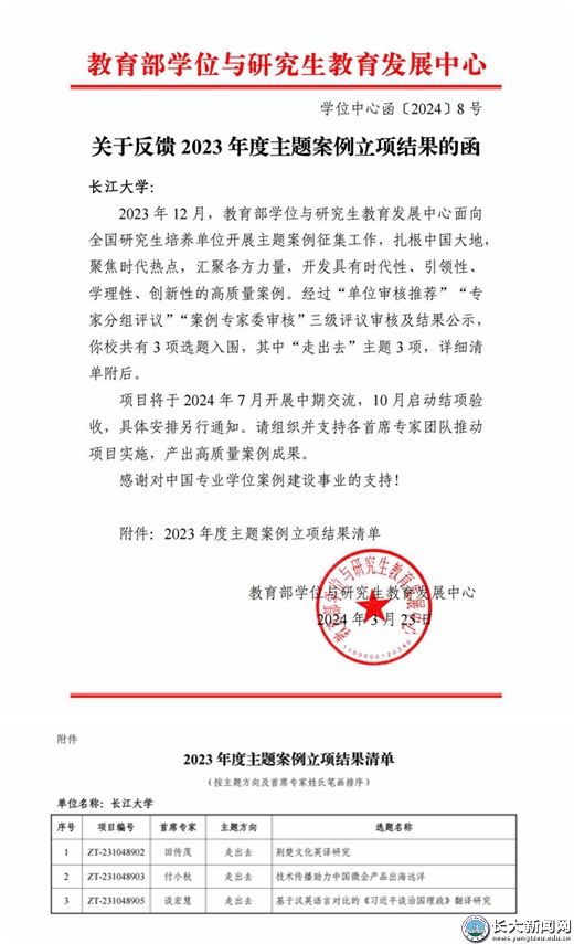 本次获批的3项主题案例分别是谈宏慧教授担任首席专家的《基于汉英语言对比的〈习近平谈治国理政〉翻译研究》、田传茂教授担任首席专家的《荆楚文化英译研究》、付小秋博士担任首席专家的《技术传播助力中国微企产品出海远洋》。三位老师积极响应教育部学位与研究生教育发展中心征集主题案例的核心目标,结合新葡萄官网AMG翻译硕士人才培养的实际需求和教学经验,围绕“走出去”主题,聚焦中国“产品走出去”“教育走出去”“文化走出去”的问题,总结中国经验、讲好中国故事,为建构中国自主知识体系提供案例视角,获得了教育部专家评委的一致认可。
