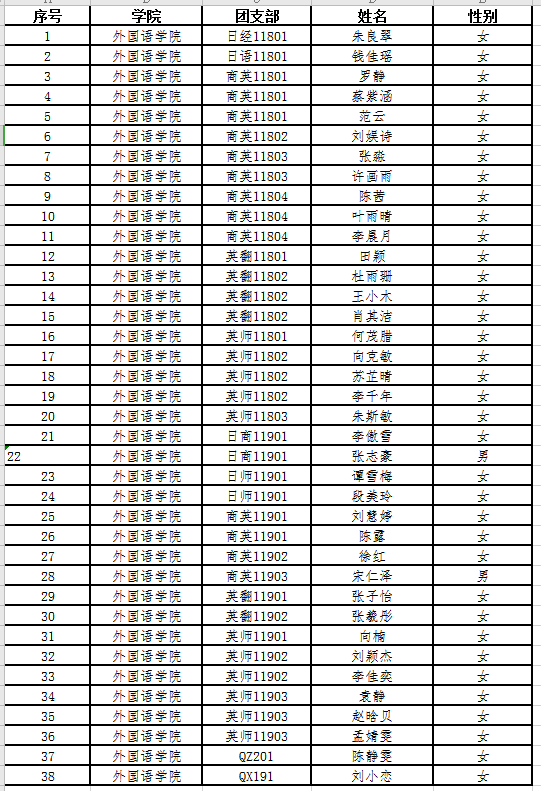 根据《共青团推优入党工作实施办法(试行)》(中青发〔2019〕9号)、《共青团新葡萄官网AMG委员会推优工作实施细则》(长大团发〔2017〕8号)文件精神,经各班团支部大会推优投票表决、院团委审核,报外语学院党委审查同意,2021年上半年(非毕业年级)团内“推优”为发展对象的名单公示如下: