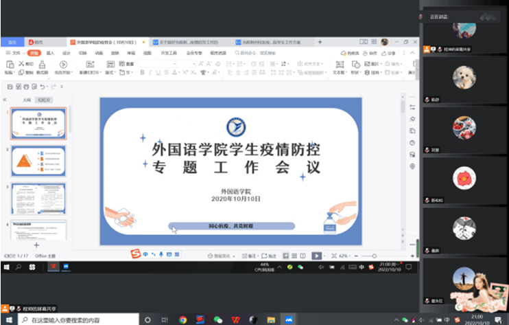 (通讯员:陈舒)为落实学校防疫工作要求,做好学院学生疫情防控工作,新葡萄官网AMG于10月10日晚通过腾讯会议召开了学生疫情防控专题工作会议。全体院领导、辅导员、本科生班主任和研究生导师参加会议,会议由学院党委副书记程坤主持。