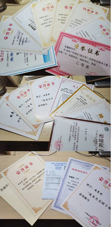 大学期间我担任了素拓队宣外部的部长,英语12108班班级助理、英翻11902班班长兼团支部书记、英语11902班学习委员等多项学生干部职责,负责组织各项重大活动,大大提升了我的办事效率和能力;我的演讲力和领导力也获得了提升,拥有了站在一个小至十余人、大至上百人的群体面前讲话而从容不迫、娓娓道来的勇气和底气。在工作中,我发现自己站在了一个更全面的角度来观察、审视、推动队伍和班级的工作:我学会如何用自己的热情带动部门内的工作,意识到各方面因素在工作中的重要性,渐渐学会了从更宏观、更深层次地看待问题和工作。经历了大学四年的不断进步,我的努力也获得了认可,我也有幸获得新葡萄官网AMG“万人创百星·学干之星”、优秀学生干部、优秀共青团干部、三好学生等多项荣誉称号。