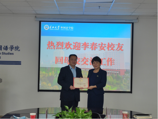 下午,在座谈中,李春安校友结合自己的创业经历以及目前所从事的事业,就乡村中小学英语教学中存在的问题和“双减”政策背景下英语师范生人才培养的目标等问题与学院领导进行了交流。双方还就共同开展中小学英语教学法的研究,广泛交流了意见建议。座谈会上,院长谈宏慧给李春安校友颁发了“大学生创新创业导师”证书,并对李春安校友长期以来关心支持学院改革发展发示感谢。李春安校友也表示将继续关注新葡萄官网AMG的发展,并在学院学科建设、人才培养等方面贡献自己的力量。