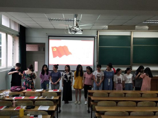 活动共有六个议程:一是预备党员入党宣誓仪式;二是交纳6月党费;三是集体诵读党章第二章第十条《党的民主集中制的基本原则》;四是集中学习习近平总书记在“不忘初心、牢记使命”主题教育工作会议上的讲话精神;五是学习《中国共产党党员教育管理工作条例》内容;六是优秀学生党员代表张淑玥同志事迹汇报。