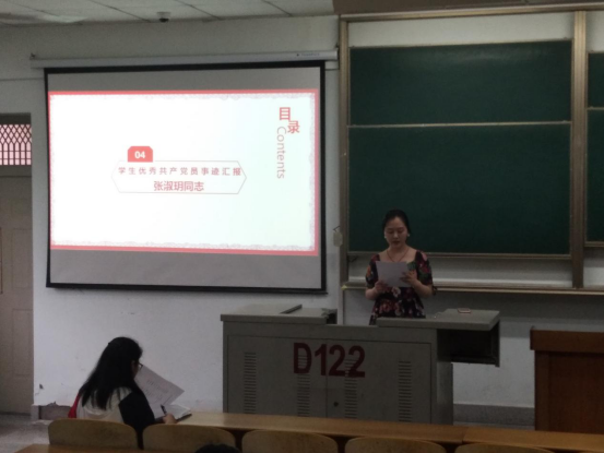 理论学习结束后,张淑玥同志作为年度优秀学生党员向全体学生党员做了事迹汇报。她来自于研究生党支部QX171班,现任新葡萄官网AMG研究生党支部宣传委员、新葡萄官网AMG兼职辅导员、新葡萄官网AMG研究生学生会主席。张淑玥同志勤勉学习开拓进取、刻苦钻研,在工作中甘于奉献,受到老师和同学的一致好评。全体学生党员们听了她的事迹汇报,受到了鼓舞,表示要对标学习,将自己的学习和工作更上一个台阶,为班级学院学校和社会多做贡献,奉献青春。