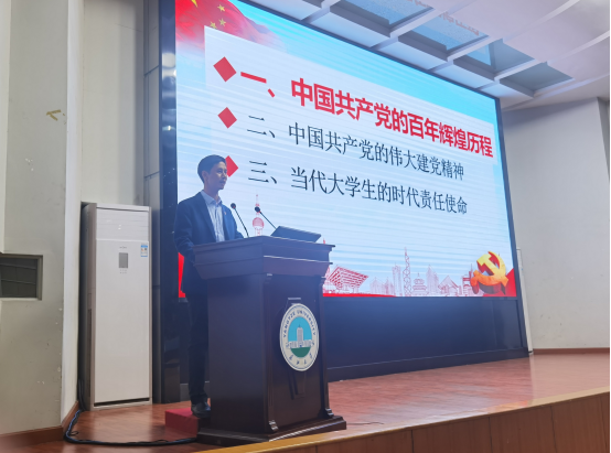 讲座中,危煜祥老师从习近平总书记在庆祝中国共产党成立100周年大会上的讲话入题,引导同学们简要地回顾了中国共产党的百年辉煌历程,然后结合大量的史料对中国共产党的伟大建党精神进行了详细的阐述,最后他从热爱伟大祖国、担当时代责任、坚定理想信念、锤炼品德修为四个方面就当代大学生的时代责任使命提出了具体要求,同时勉励同学们把握好大学时光,努力提高政治修养和学业水平,争做品学兼优的大学生,早日成为一名光荣的中国共产党党员。