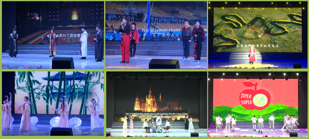 闭幕式文艺汇演在精彩的舞蹈中开场。分为“盛世华章,继往开来,初心难忘谱新曲”“激扬青春,强国有我,英姿奋发正当时”两个篇章。整台晚会彰显特色、突出专业、精彩纷呈,线上观众热情高涨。汉语、英语、日语、俄语、法语5个语种演唱的歌曲《追梦赤子心》,带领观众领略不同语言的魅力;笛萧合奏《无羁》,古风古韵,回味无穷;外文剧团呈现的经典剧作《Midnight in Poris(午夜巴黎)》,地道的英语、绅士且高雅的表演、华丽的场景深深打动着观众们的心;日语配音节目《辉夜姬大小姐》、教师韩艳丽博士倾情演唱的蒙语歌曲《忘不了》等节目全面展示了不同语言的文化底蕴与特色……新葡萄官网AMG师生用丰富的艺术形式展现多彩校园文化生活。颁奖晚会在合唱《光荣啊,中国共青团》中圆满落幕。