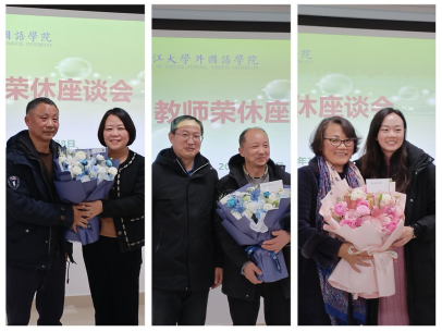 随后,三位荣休教师依次发言,回忆起从教生涯的点点滴滴,眼中满是眷恋与不舍。夏永红老师讲述了与荆州博物馆合作进行中国文化宣传的难忘经历,吴亚华老师分享了参与编撰教材与运用到课堂教学的融合经验,徐灵老师提及那些年在一工部教学生活的日子,情到深处,令人动容。