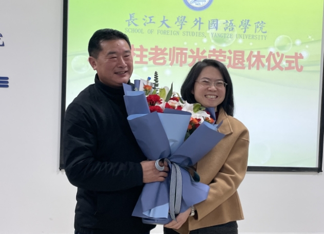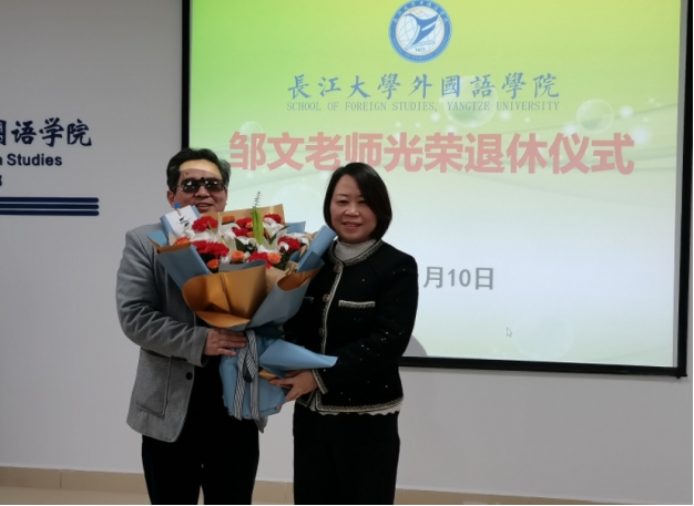 院长谈宏慧、副院长付小秋、日语系教师常芬分别为邹文老师、汪邦柱老师、青山优太郎博士献上了美丽的鲜花。