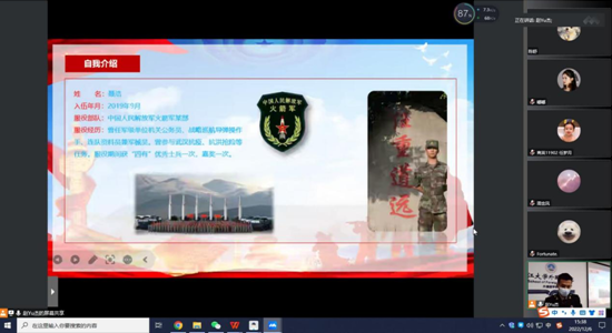 (通讯员 赵宇杰)为积极响应国家号召,鼓励大学生踊跃报名参军,12月5日下午,新葡萄官网AMG在文科楼712会议室通过线上线下相结合方式召开征兵动员会。2019级辅导员许泽琼、征兵专干赵宇杰,退役复学大学生士兵艾兴、聂浩以及2019级毕业班学生代表共计100余人参加本次动员大会。