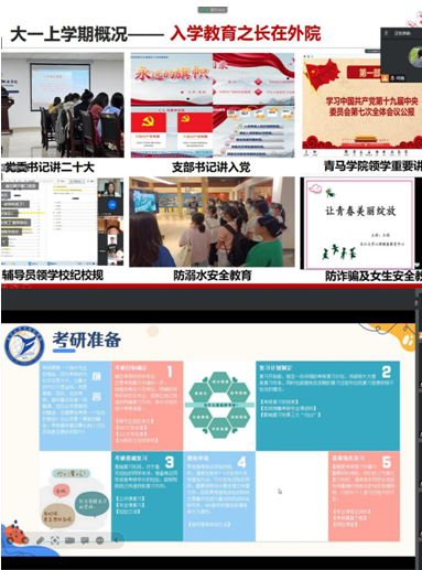 2020级辅导员童超汇报了年级基本情况,从学科竞赛、专四考试、资助育人等五个方面汇报上学期年级工作,就下学期重点关注的就业与考研问题与家长们进行分享交流,与家长共同分析现阶段就业工作与考研的重点、难点。