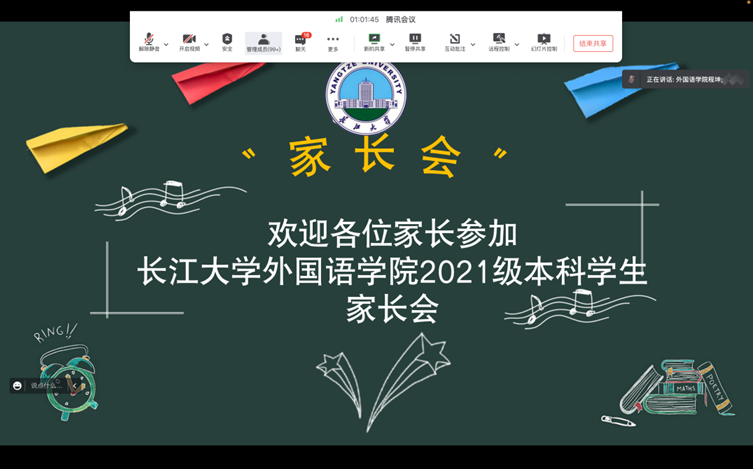 程坤就目前各年级学生所面临的问题和挑战进行了分析。他指出,随着后疫情时代的到来,学生面临的压力与挑战是前所未有的,如何从危机中育新机是现阶段学院、家长和学生都需要共同发力的方向。他强调,学生目前不仅要牢牢把握好第一课堂,掌握扎实的专业基本功,还需要不断地去扩展第二课堂,多参加学科竞赛,在增长见识、培养专业能力的同时锻炼自己各方面能力,为今后考研和就业打下良好的基础,真正成为符合时代要求的外语类人才。对于毕业班的学生,他希望家长们积极参与关注学生思想和心理变化,用良好的心态对待学生即将面临的升学、就业工作,在孩子心理健康、自主发展、求职就业等方面需要家长与学校通力配合,共同促进学生成长成才。