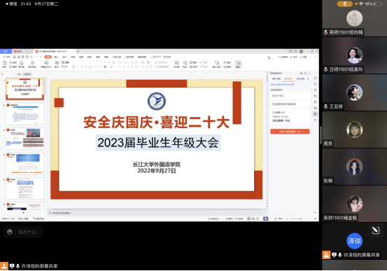 为确保学生国庆期间以及在校期间安全,严防各类事故发生,牢牢守住安全底线,迎接党的二十大胜利召开。9月27日,新葡萄官网AMG组织本科生及研究生各班召开“安全庆国庆·喜迎二十大”主题班会,会议采用线上线下结合模式。班会围绕疫情防控、防诈骗教育、防溺水安全教育三个方面展开。