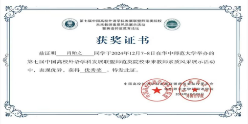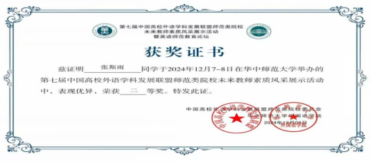 (通讯员 张斯雨)为全面提升师范类院校学生英语教学技能和教学水平,推动未来卓越英语教师综合素养的培养,发挥职前教师教育的引领示范作用,由中国高校外语学科发展联盟主办,华中师范大学承办的“第七届中国高校外语学科发展联盟师范类院校未来教师素质风采展示活动”,于12月8日成功落下帷幕。在此次盛会中,新葡萄官网AMG鲁志荣老师悉心指导的22级学生张斯雨同学荣获二等奖、肖贻之同学荣获优秀奖,展现了我院学子的卓越风采。