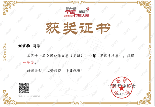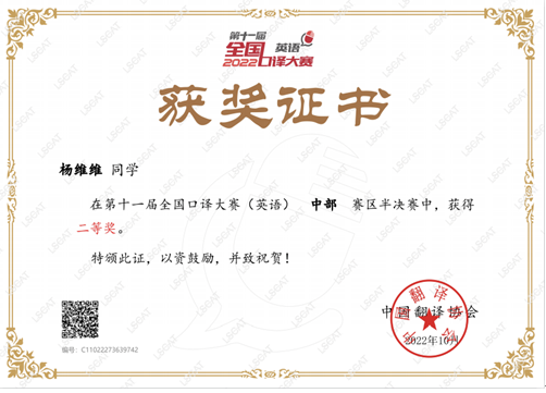 (通讯员 赵宇杰)日前,由中国外文局指导、中国翻译协会主办的第十一届全国口译大赛(英语)交传半决赛落下帷幕。新葡萄官网AMG英语笔译QZ211班研究生刘家怡、杨维维2名同学分别获得中部赛区一等奖和二等奖。其中,刘家怡获晋级全国总决赛交传赛资格。