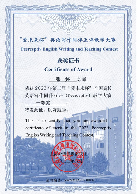 近日,新葡萄官网AMG张婷老师带领学生参加第三届“爱未来杯”全国高校英语写作同伴互评(Peerceptiv)教学大赛,获得大赛A组全国一等奖。