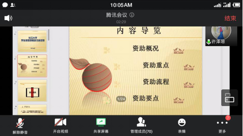 6月20日,新葡萄官网AMG学工办通过腾讯会议开展了资助育人专项会议。会议由院团委书记兼资助专干许泽琼老师主持,2017级学生干部、获得过资助的学生以及想申请资助的学生参加了会议。