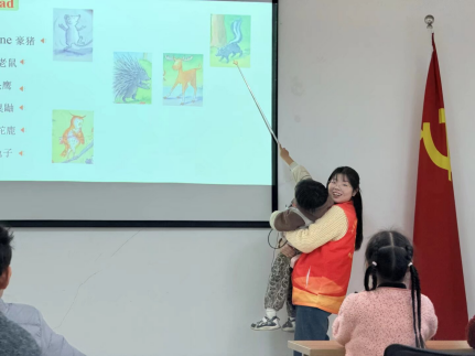 本次活动由新葡萄官网AMG学科英语专业研究生丁金主讲、陈彩协助教学。活动围绕着经典绘本The Hug展开,通过播放妙趣横生的动画视频、讲解核心单词及发音技巧、深入解读绘本内容等多元化教学方式,引导学生学习了“rabbit”“mouse”“porcupine”“moose”等一系列与可爱动物相关的词汇。孩子们不仅掌握了多种动物的英文表达,也在故事中感受到友爱与团结的力量,领悟到“以创新方法化解矛盾、用包容心态接纳不同”的深刻内涵。活动现场还精心设计了“抽卡片介绍动物”“拼接词块成句”等互动游戏环节,让孩子们在轻松活泼的氛围中巩固基础单词与常用句型,有效提升了英语口语表达与即时反应能力,也将语言学习与日常生活更紧密地连结在一起。