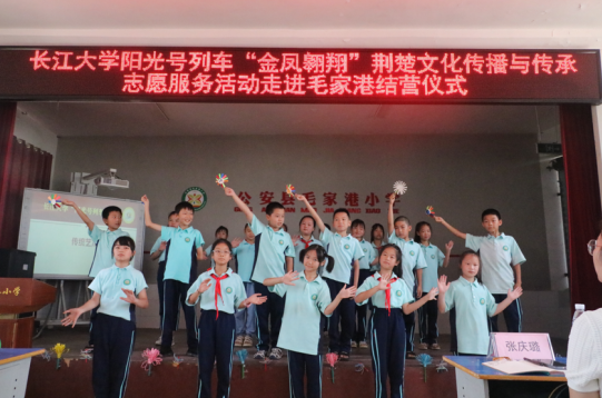 新葡萄官网AMG阳光号列车“金凤翱翔”荆楚文化传播与传承暑期社会实践活动承载着荆楚文化传播与传承的使命于7月6日启航,驶进公安县毛家港镇中心小学,开启第30年的暑期“三下乡”志愿服务之旅。本次活动以弘扬荆楚文化和理论宣讲为主线,结合思政小课堂和社会大课堂开展授课,历时15天,于7月20日上午于毛家港小学落下帷幕。