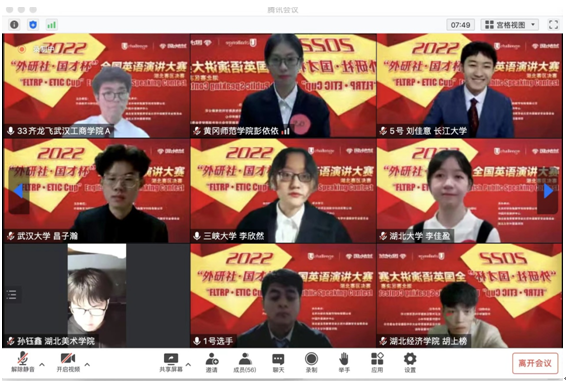 据悉,“外研社·国才杯”全国英语演讲大赛是外语教学与研究出版社联合教育部共同举办、面向全国高校在校大学生的英语演讲国内最高公益赛事,也是教育部推荐的A类赛事。该赛事每年吸引全国数百万大学生报名参加,不但激发大学生的英语学习热情,更影响着全国大学生树立跨文化交流意识,拓展国际视野,致力于构建人类命运共同体,用英语向世界传播中华文化。此次湖北赛区决赛共有来自武汉大学、华中科技大学、湖北大学等全省高校的20名选手参加。