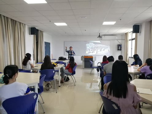 以“我们心中的公共演讲是什么?”引入主题,罗博老师带领选手们一同思考。他从问题类型、提问角度、准备工作和注意事项几方面帮助同学们解决评委提问难关。回答提问时第一,切记仔细听题,倘若有没听清楚或者没听懂,一定不要急着随意作答。通过沟通交流或礼貌提问再次确认问题也是可行的。第二,回答问题时直截了当。给出明确的答案,同时需注意条理,整个回答要完整。尽可能出彩、有深度、有创意。结尾部分可以再次快速简明总结自己的观点,并以短暂停顿加Thank you结束回答,不建议使用That's all。准备工作中,定稿后要逐字逐句地进行推敲、斟酌、梳理找出可能出现的问题,注意逻辑性;并且对选取的例子和个案进行纵深调研,对所选的人物和故事做深入研究;平时训练中多与老师和同学们进行头脑风暴,多方面征求意见,多角度多层次思考问题;回答问题时最好与自身经历紧密结合;反复训练定题演讲和问答环节,逐步完善。最后通过观看去年亚、季军比赛视频,具体分析其选手的优缺点,同学们汲取经验教训。