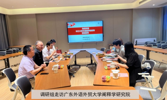 6月11日下午,调研组走访了广东外语外贸大学阐释学研究院,该院是我国阐释学研究的重要基地,在该领域有较高的学术影响力。阐释学研究院院长陈开举教授热情接待并详细介绍了阐释学的概念内涵和发展历程。他还生动地解读了荆楚文化的内涵,使调研组老师对阐释学及区域文化有了更深入的理解。双方探讨了共同建立“阐释学与荆楚文化研究”课题的可行性。广东外语外贸大学国际商务英语学院徐章宏教授、肖武东老师和阐释学研究院博士后殷立飞也应邀出席座谈。调研组与各位专家就英语专业的人才培养目标、就业情况、跨文化课程开发、访问学者项目等议题进行了深入的交流探讨。